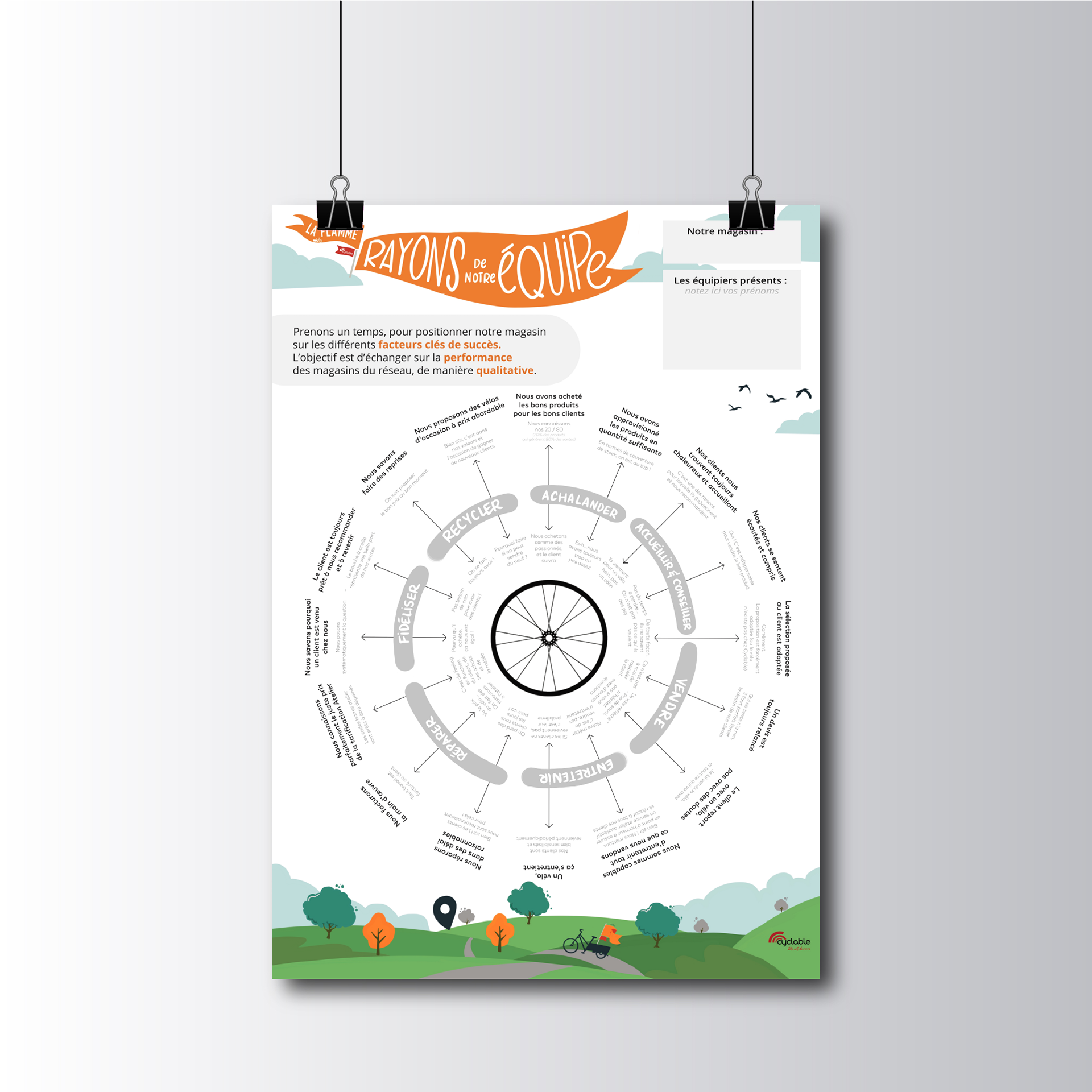 Jeanne Bernard, s'est chargée de concevoir le déroulé de l'atelier et du contenu. J'ai ensuite fait la mis en forme pour en faire un kit auto-porté afin que les référents de chaque magasin puissent l'animer en autonomie puis rouler en vélo cargo jusqu'au magasin Cyclable suivant.