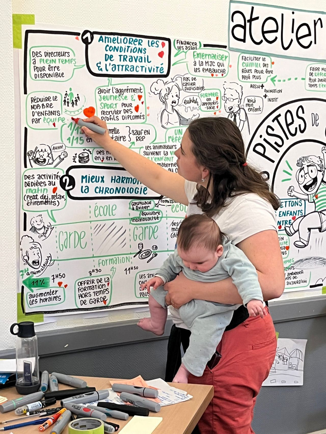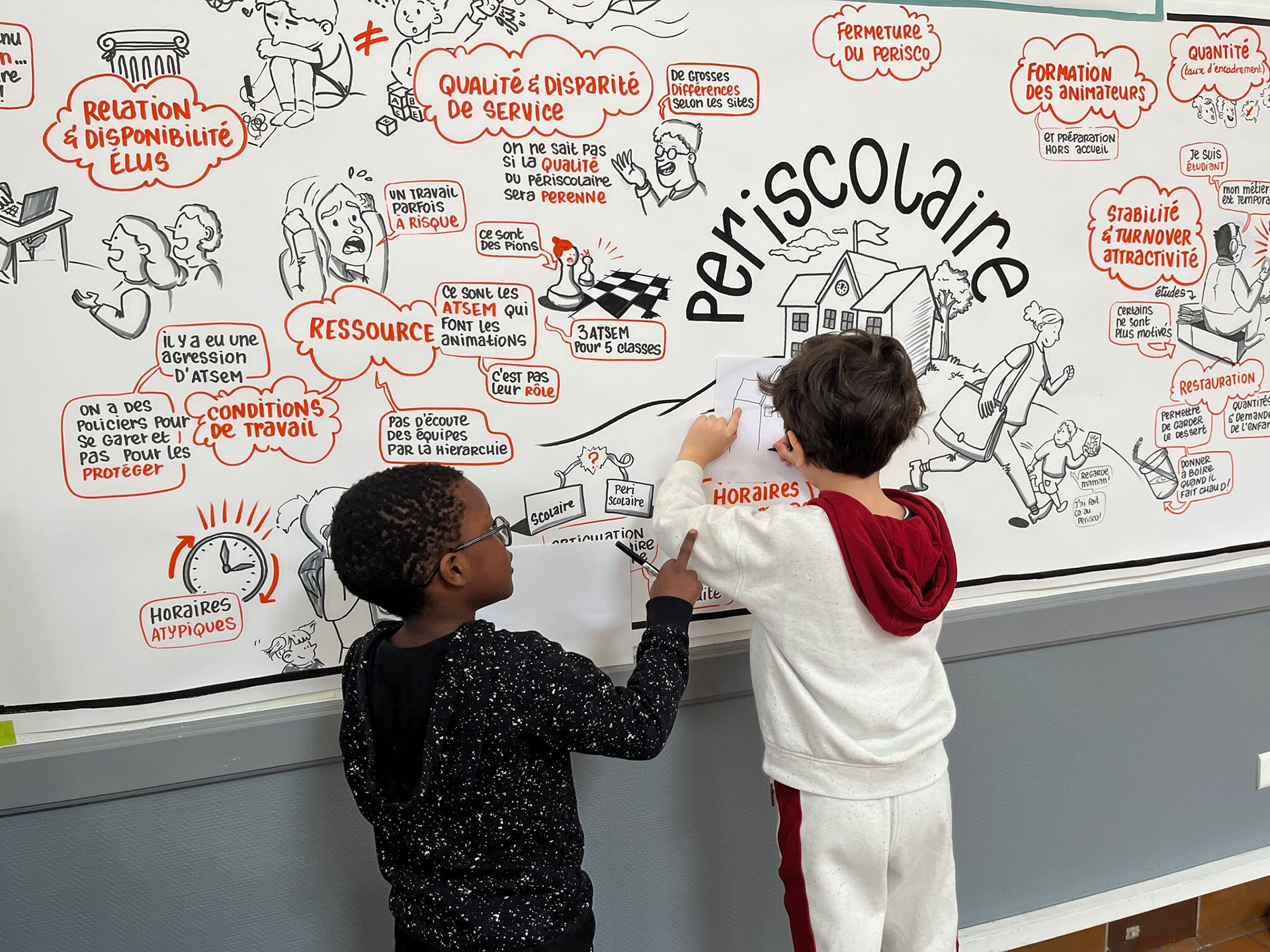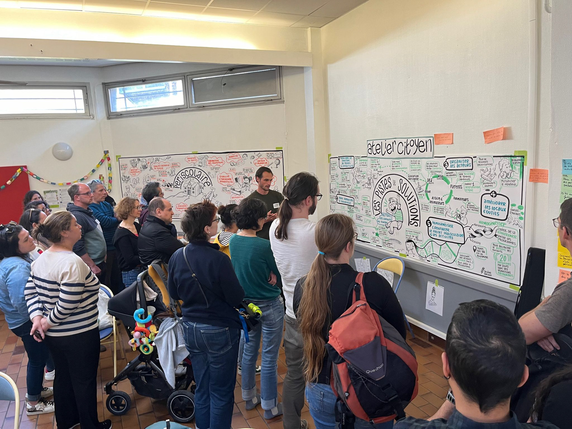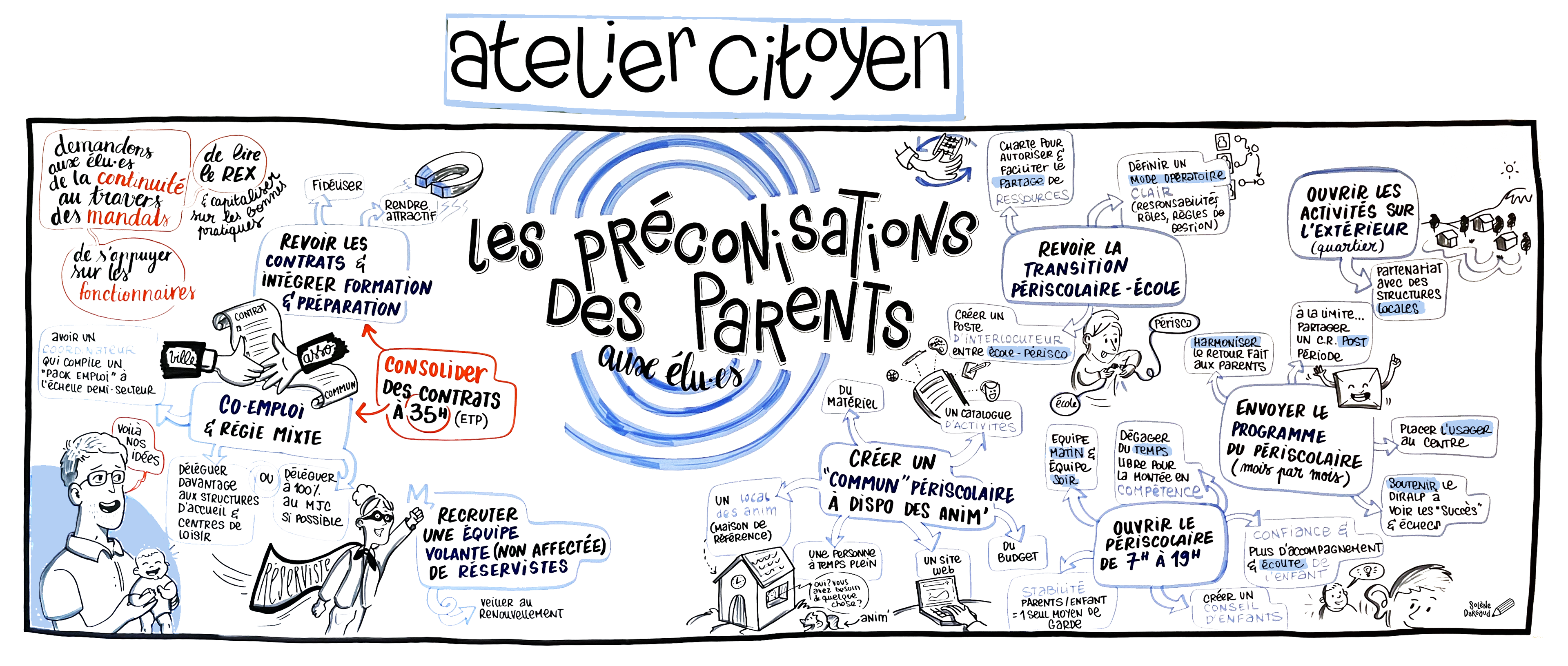 Pour cela, nous avons organisé 4 ateliers citoyen pour recueillir auprès des parents d'enfants, les problèmes (visuel 1), les pistes de solutions (visuel 2), les leviers de transformation du périscolaire (visuel 3), les préconisations des parents (visuel 4).