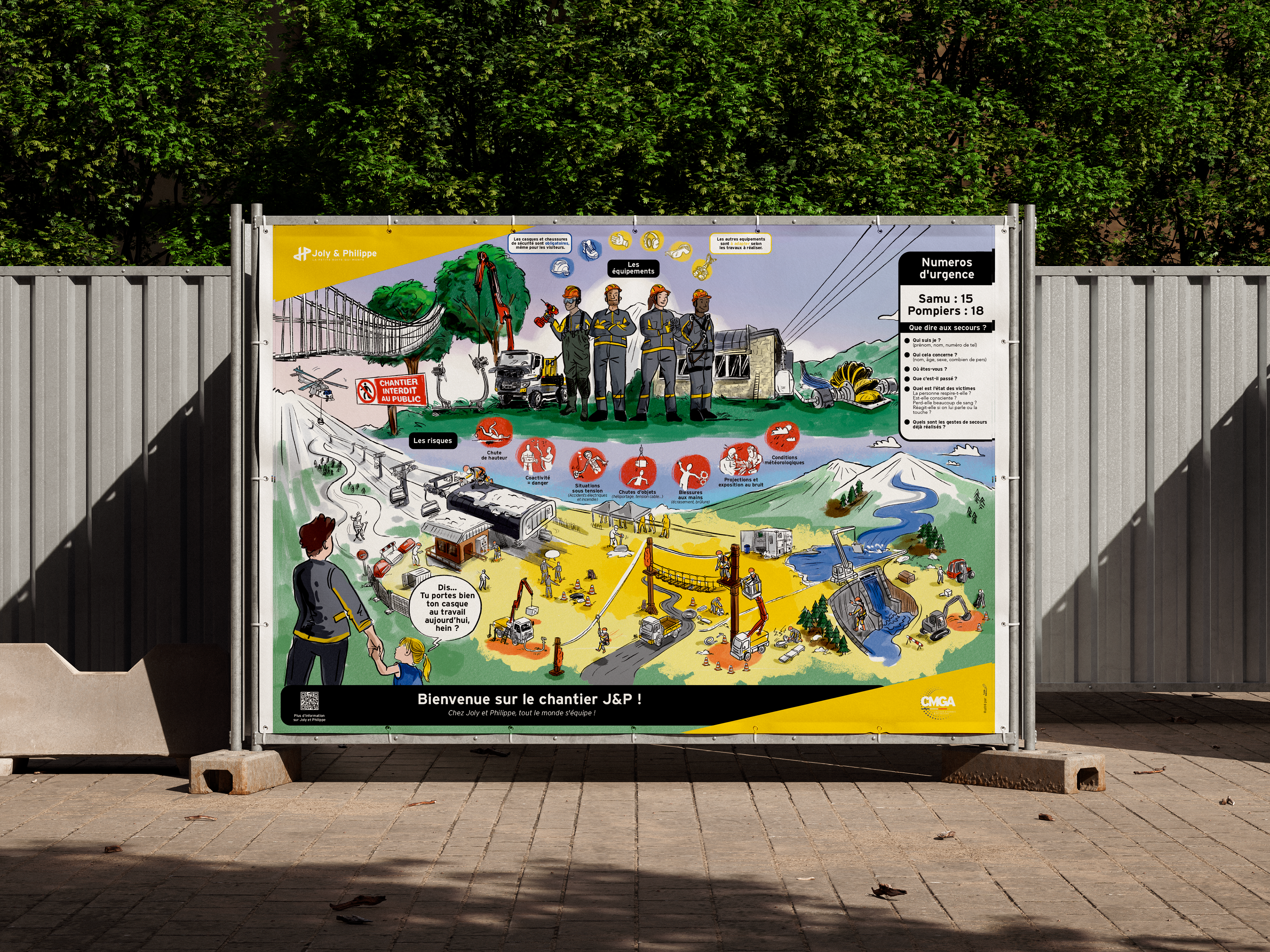 Réalisation d'un affichage ludique pour sensibiliser aux risques dans les métiers de la construction en haute montagne, pour les chantiers Joly & Philippe.