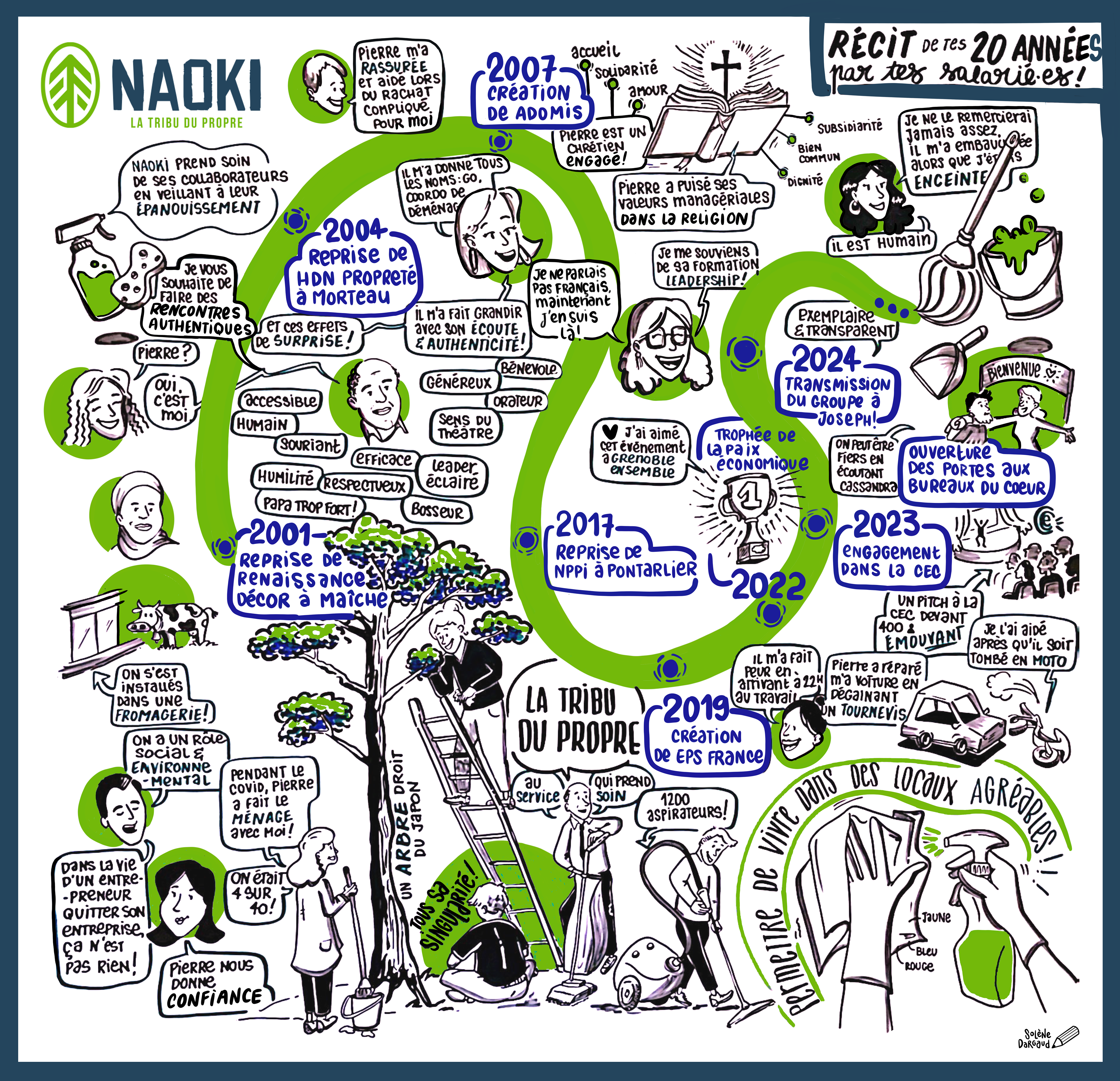 On m'a contactée pour le départ à la retraite du fondateur de NAOKI. A l'occasion de cet événement, on m'a demandé de dessiner les grandes lignes de l'histoire et NAOKI et de collecter des verbatims et souvenirs avec le fondateur auprès de ses collaborateurs.